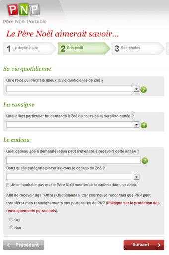 Vous pouvez facilement insérer le prénom du destinataire, son âge, une ou des photos, et en mentionnant le cadeau souhaité. Dans la console Père Noël Portable, le message peut être visualisé avant de le partager sur Facebook, Twitter ou par email.